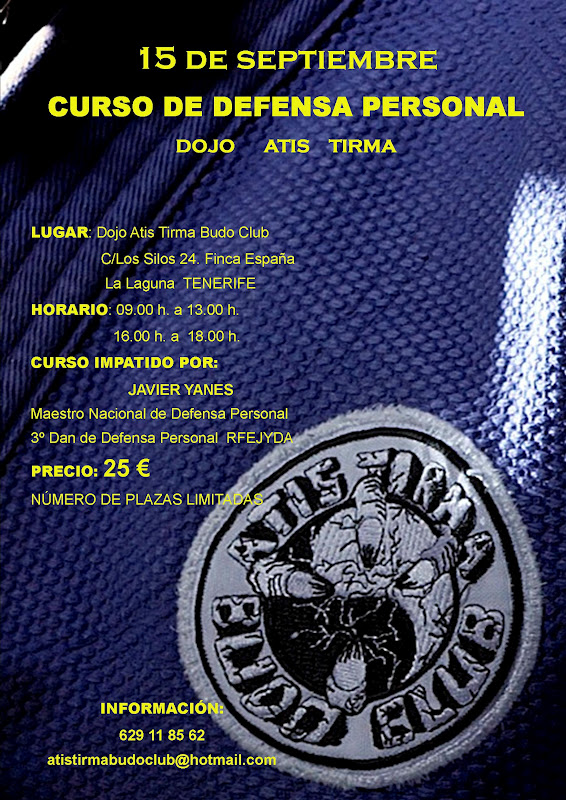 NOTA IMPORTANTE: Debido a la gran acogida del Curso de Defensa Personal de este sábado día 10 de marzo, se amplía el plazo de inscripción del mismo hasta mañana viernes por la noche, y trasladamos, debido al espacio limitado, la celebración del curso a las instalaciones del GIMNASIO VISTABELLA, en al calle La Milagrosa, nº 24, La Cuesta - La Laguna. Anímense todos aquellos que se habían quedado con ganas!!